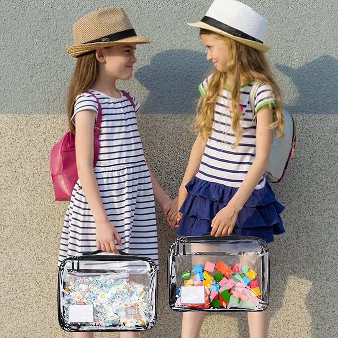 4 Pack Toy Storage Organizer Bag for Lego Bricks, Clear PVC Zippered Block Set with Manual Pocket& Name Tag, Waterproof Toy Carrying Case for Board Games, Building Blocks& Puzzles (Large Black)