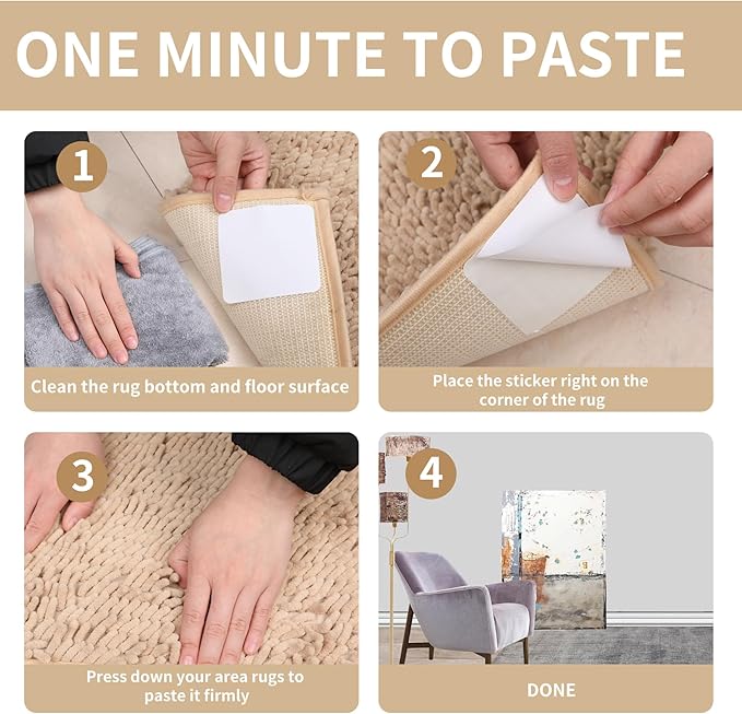 - 【QUANTITY】The kit includes 4 pieces. Each piece is square, which increases the contact area with the floor and provides better grip than the triangular shape of other rug stickers.