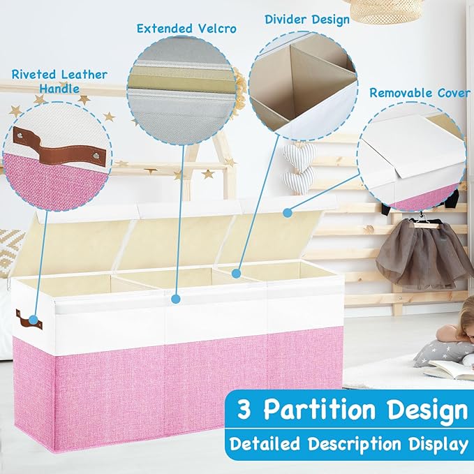 - Elegant Design-Our toy box features a two-tone stitching design and faux leather handles on both sides secured with metal rivets, creating a light luxury and elegance effect for your home. Three Velcro-fastened lids ensure easy access while also allowing you to stack other lighter items on top.
