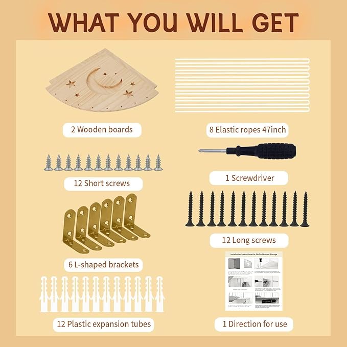 - Ease of Installation:Our stuffed animal storage kit contains assembly parts,tools,installation instructions,simple and convenient,position and height can be adjusted according to your needs to adapt to different spaces and toy sizes,this flexibility makes installation more convenient and does not need to worry about size mismatch