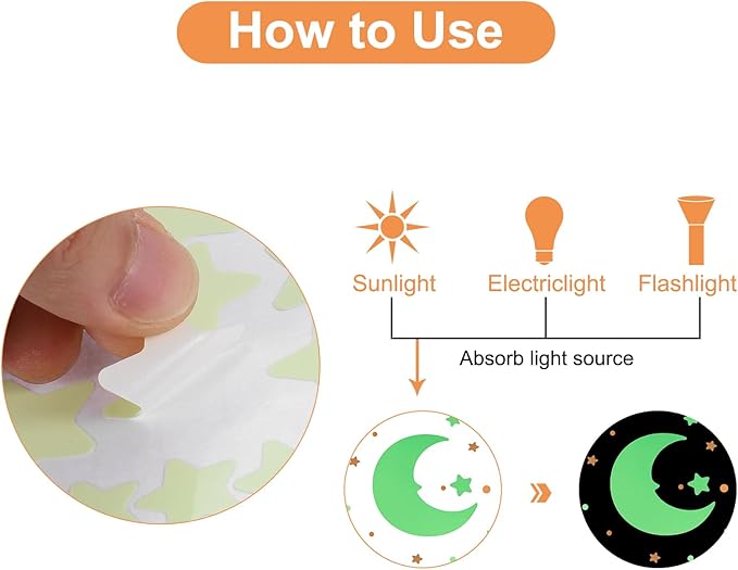 - [Easy to Use] - These self-adhesive decals can be easily pasted on clean and smooth ceilings and walls, just peel them off the paper and stick them on the wall, you can see the light emitted by these glowing stickers at night