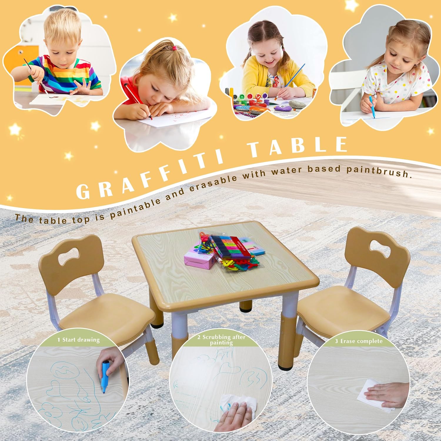 Kids Table and 2 Chairs Set with Graffiti Desktop, Toddler Furniture Set, Non-Slip Table Children Study Desk, Dining Table, Height Adjustable Desk, Painting Desktop for Kids (23.6x23.6Inch)