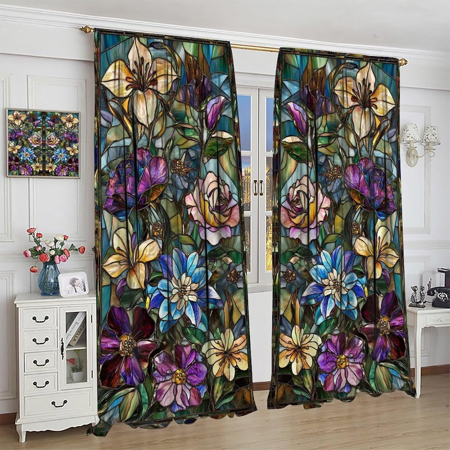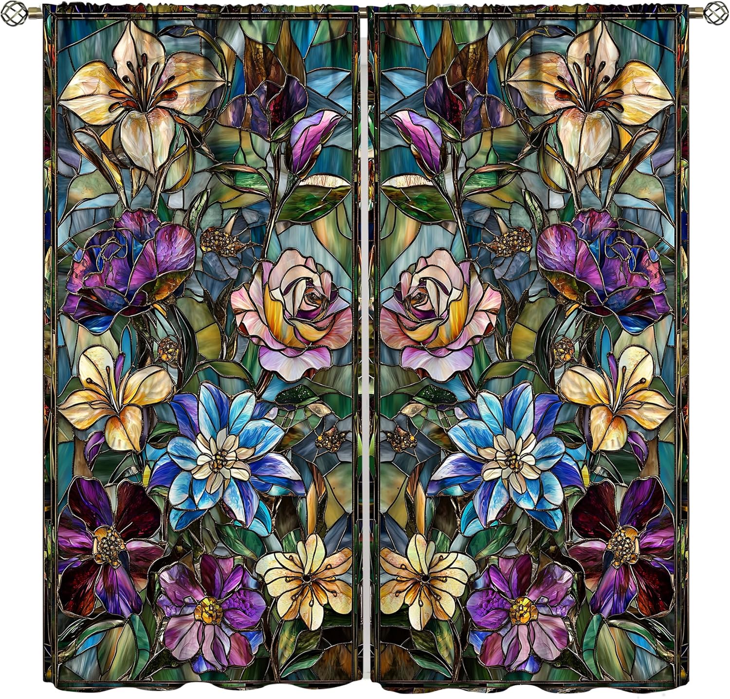 Stained Glass Curtains,Retro Colored Glass Flowers Art Home Decor Drapes for Bedroom Living Room Kitchen Window Treatment 2 Panels Set Total Size 55" W X 63" L Inch