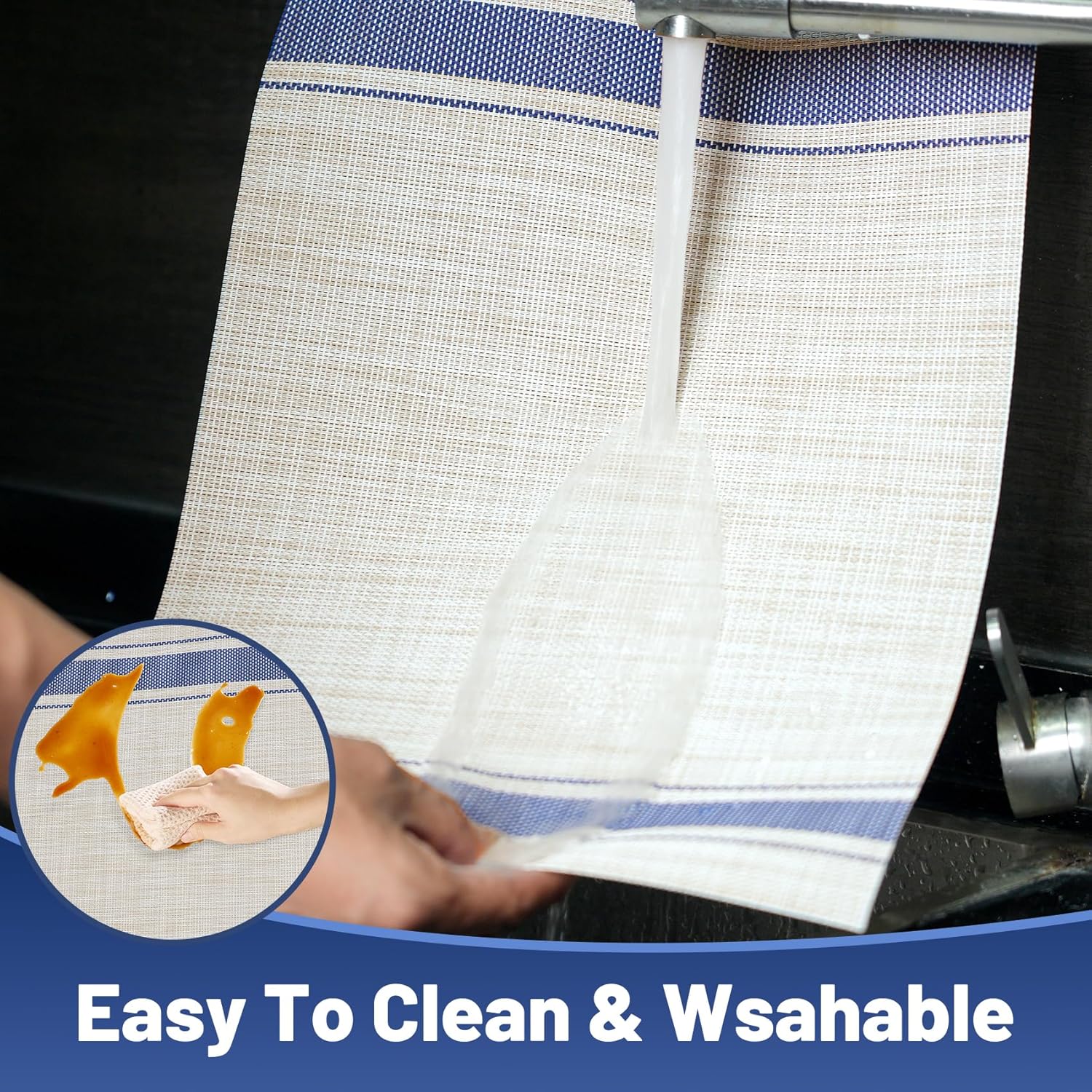 - 【East To Clean】——The washable placemats can be washed repeatedly.How to clean the place mats for kitchen table:Simply wipe with soap,water and a soft sponge or cloth.Scrub stubborn stains with a soft bristle-brush and a bleach-based cleanse.