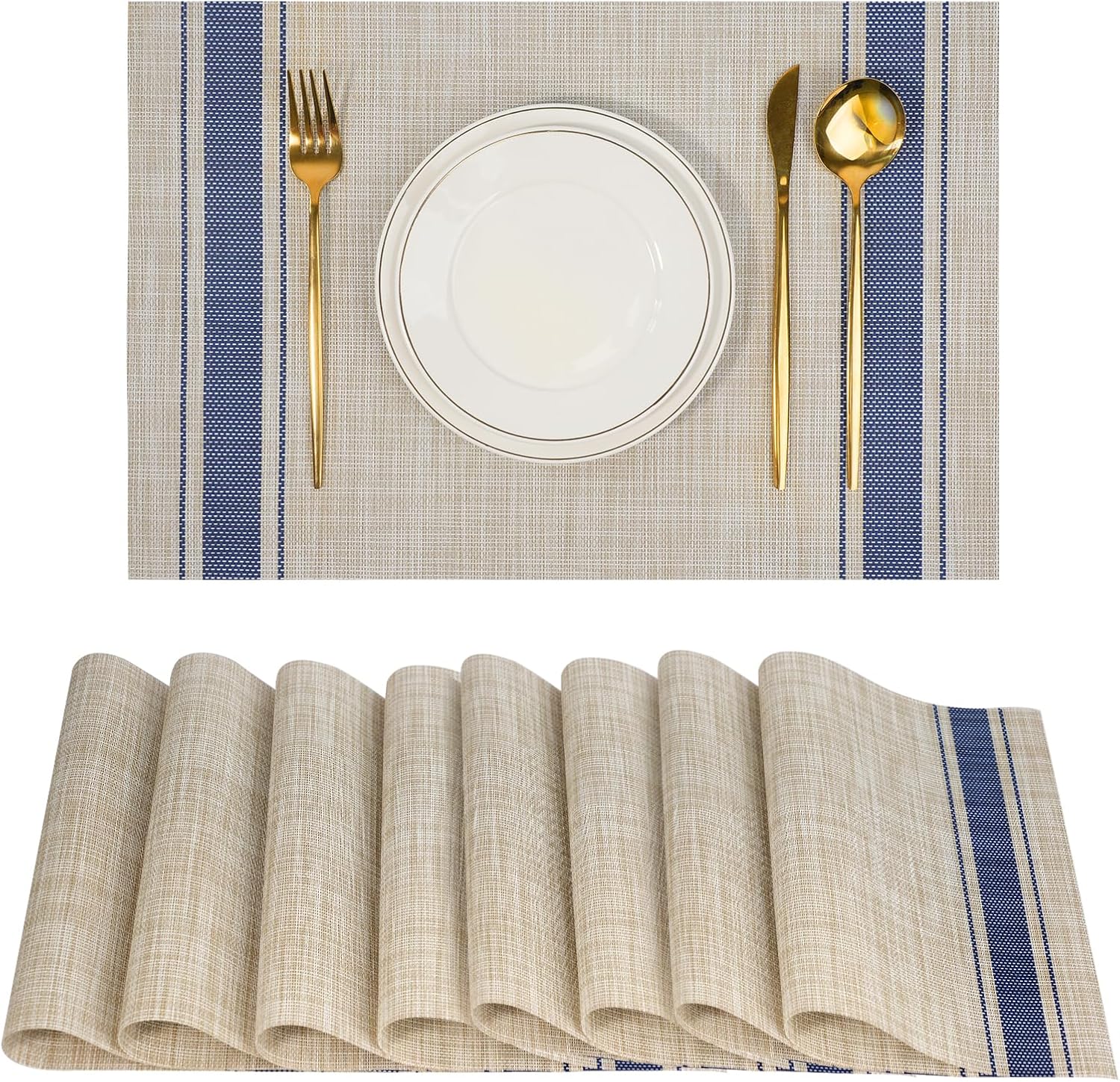 Placemats Set of 8,Non-Slip PVC Weave Table Mats Easy to Clean,Heat Resistant Place Mats for Kitchen Dining Table Decoration Indoor Outdoor,Khaki Blue